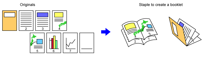 Place the original in the document feeder tray of the automatic document feeder, or on the document glass.Tap the [Others] key and then the [Booklet] key, or tap the [Staple Sort] key and then the [Saddle Stitch] key.