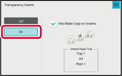 Place the original in the document feeder tray of the automatic document feeder, or on the document glass.Tap the [Others] key, and then tap the [Transparency Inserts] key.