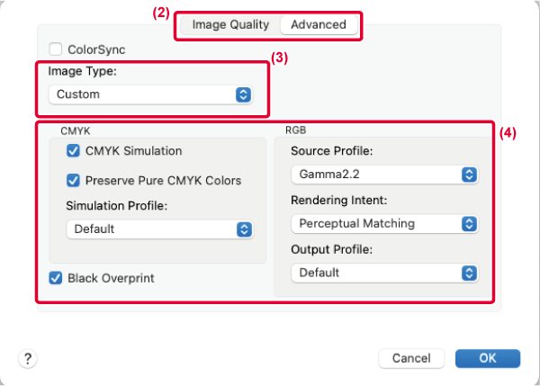 The selections below provide the ability to modify color image processing to suit specific preferences. (Color matching method: Method of color converting RGB colors on the display, etc. into CMYK colors in the printer) |