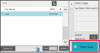 Multiple files can be selected. The tapped file will be marked with a check mark. To select all files in a folder, tap the [Select All] key. To delete the selected files, tap the [Delete] key. Select one of the files and tap "Check Image" in the Action Panel to check the preview image of the print data. The operation of the preview screen is the same as the method for checking images in document filing. See " FILE IMAGE CHECKING". You can also tap "See Detail Information" on the Action Panel to check detailed information such as the print size of the file. When you want to print a file, proceed to the next step.Confirm print settings and tap the [Print Now] key.