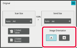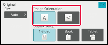 See the figure on the left to check the binding edge of the original and select the key to be tapped.Tap the [Image Orientation] key with the same orientation as the placed original.