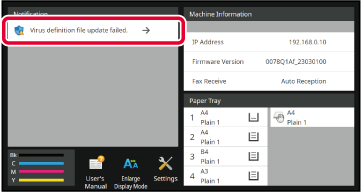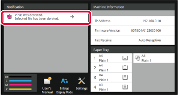 When a virus is detected with respect to the input data, the touch panel will display that a virus has been detected, the input data or the job to be input will be cancelled, and the data or job data that was about to be output will be discarded. Data in the data input source (USB memory, external server, etc.) will not be deleted. When a virus is detected with the output data, the touch panel will display that a virus has been detected, the output data or the job to be output will be cancelled, and the output data or job data will be deleted. The virus detection message will be displayed in the "Notification" of the System Information screen. |
