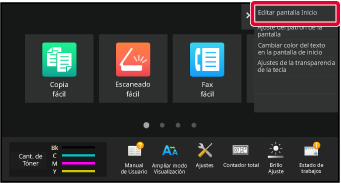 La pantalla cambia a la pantalla de ajustes.Toque [Configuraciones del sistema] → [Configuración de la pantalla de inicio] y después toque la tecla [Posición del botón de inicio].