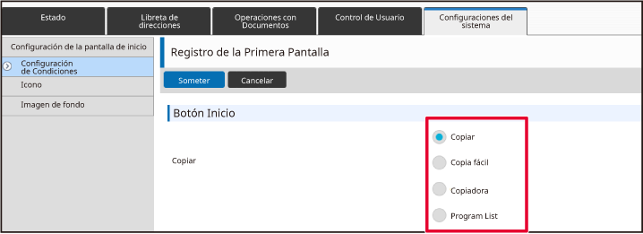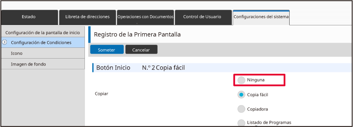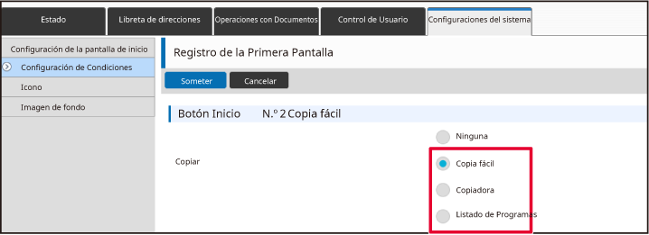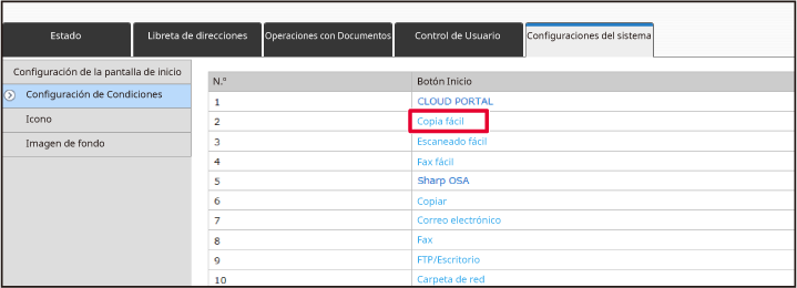 Algunos ajustes pueden requerir que introduzca su contraseña de usuario tras hacer clic en [Configuración de la pantalla de inicio]. Si no realizó la autenticación de usuario, deberá introducir la contraseña de administrador.Haga clic en [Configuración de Condiciones] y después haga clic en la tecla de acceso directo que desee cambiar.