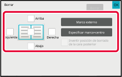Pulse la pantalla de valores numéricos que indica el área del ancho de borrado para el anverso o el reverso, e introduzca el área mediante las teclas numéricas.Pulse la tecla [Color Iniciar] o la tecla [B/N Iniciar] para iniciar la copia.
