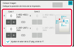 Pulse la pantalla de valores numéricos que indica el área de desplazamiento del margen para el anverso o el reverso, e introduzca el área mediante las teclas numéricas.Pulse la tecla [Color Iniciar] o la tecla [B/N Iniciar] para iniciar la copia.