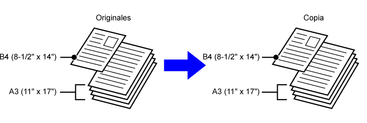 Use esta configuración cuando los originales tengan 2 tipos de tamaños distintos y no tengan lados con la misma longitud. Esta configuración sólo se puede utilizar para las siguientes combinaciones de tamaños: • A3 y B4 • A3 y B5 • B4 y A5 • A4 y B5 • B4 y A4R • B4 y A5 • B5 y A4R • B5 y A5 • 11"x17" y 8-1/2"x14" • 11"x17" y 8-1/2"x13" • 11"x17" y 5-1/2"x8-1/2"