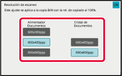 La resolución se puede establecer tanto para el alimentador de documentos como para el cristal de exposición. Una vez completada la configuración, toque consecutivamente las teclas [OK] y [Atrás].Coloque el original.