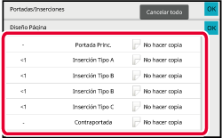 Para salir de este trabajo después de comprobar el diseño de página, toque la tecla [OK].Modifique la configuración de la portada o la hoja de inserción.