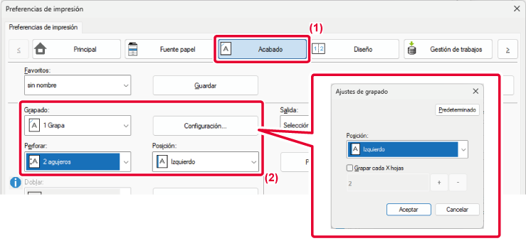 Las posiciones de grapado y el número de grapas se pueden