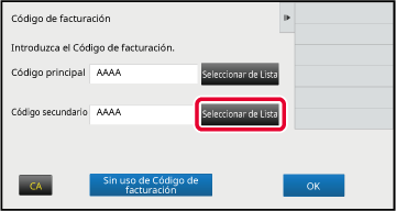 Cuando se abra la ventana de introducción del código de facturación, toque [Seleccionar de Lista] del código principal.