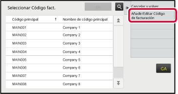 Para registrar un código secundario nuevo, pulse la tecla [Seleccionar de Lista] del código secundario.Toque [Añadir/Editar Código de facturación] en el panel de acciones.