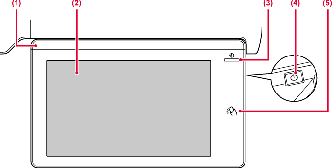 on [Virta]-painike, tietojen merkkivalo ja kosketusnäyttö.