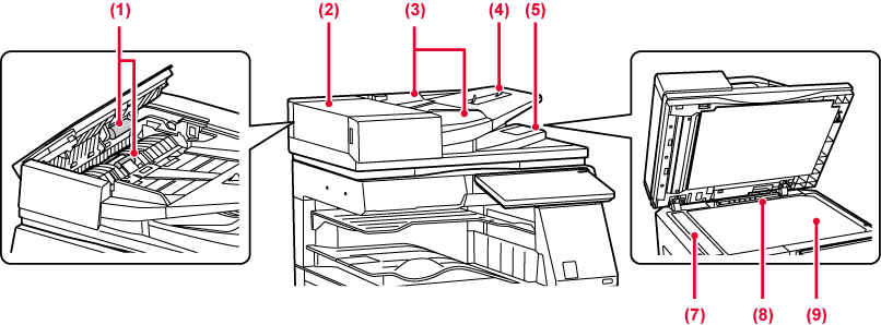 Se syöttää ja skannaa automaattisesti useita alkuperäisiä asiakirjoja. 2-puoleiset alkuperäiset voi skannata automaattisesti. Malleilla BP-56C26/BP-71C31/BP-71C36/BP-71C45/BP-71C55/ BP-71C65 voidaan skannata 2-puolisten alkuperäisten molemmat sivut kerralla.