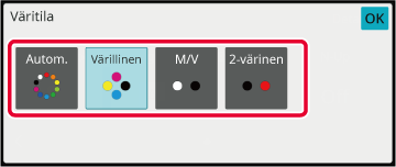 Kone havaitsee onko alkuperäisasiakirja värillinen vai mustavalkoinen ja vaihtaa tilan (väritila värilliselle alkuperäiskappaleelle tai mustavalkotila mustavalkoiselle alkuperäiskappaleelle). |
