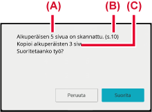 Skannattujen alkuperäisten arkkien lukumäärä tulee näkyviin vahvistusikkunassa kohtaan (A), skannattujen sivujen määrä kohtaan (B) ja kopioiden lukumäärä tyhjiä sivuja lukuun ottamatta kohtaan (C).Voit säätää taustaa tekemällä alkuperäisen