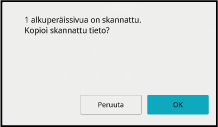 Näytössä näkyvä arvo on skannattujen alkuperäisten arkkien lukumäärä, ei skannattujen alkuperäisten sivujen lukumäärä. Kun esimerkiksi yksi alkuperäinen kopioidaan kaksipuolisena, näyttöön tuleva luku "1" osoittaa, että yksi alkuperäinen arkki on skannattu. Näytössä ei siis ole "2" osoituksena siitä, että sivun molemmat puolet on kopioitu.Aloita kopiointi koskettamalla [OK]-näppäintä.