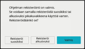 Näkyviin tulee ilmoitus rekisteröinnin onnistumisesta.Valitse, haluatko lisätä ohjelman aloitusnäyttöön tai suosikkeihin.