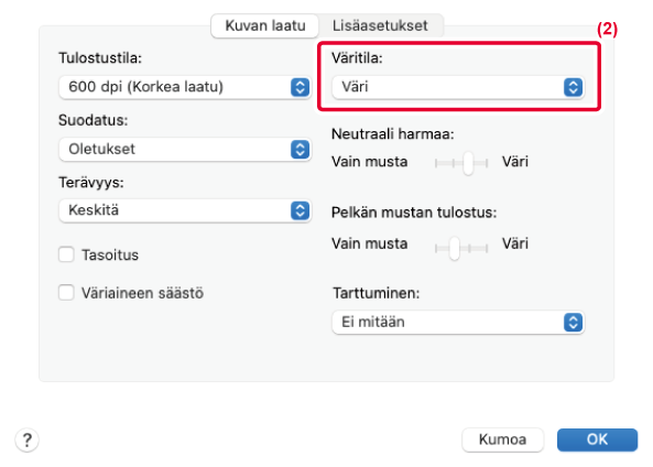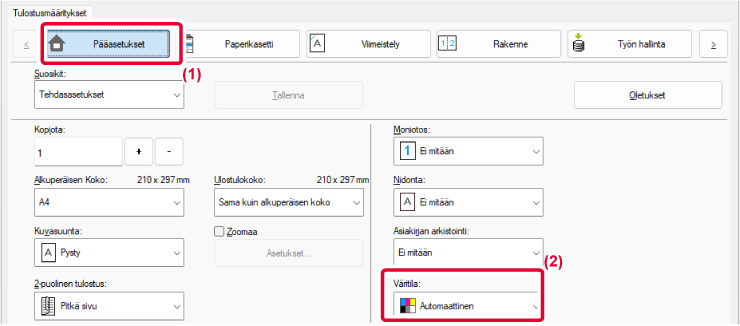 Kaikki sivut tulostetaan värillisinä. Sekä värilliset että mustavalkoiset sivut tulostetaan käyttämällä Y (keltainen), M (magenta), C (syaani) ja Bk (musta) -värejä. |