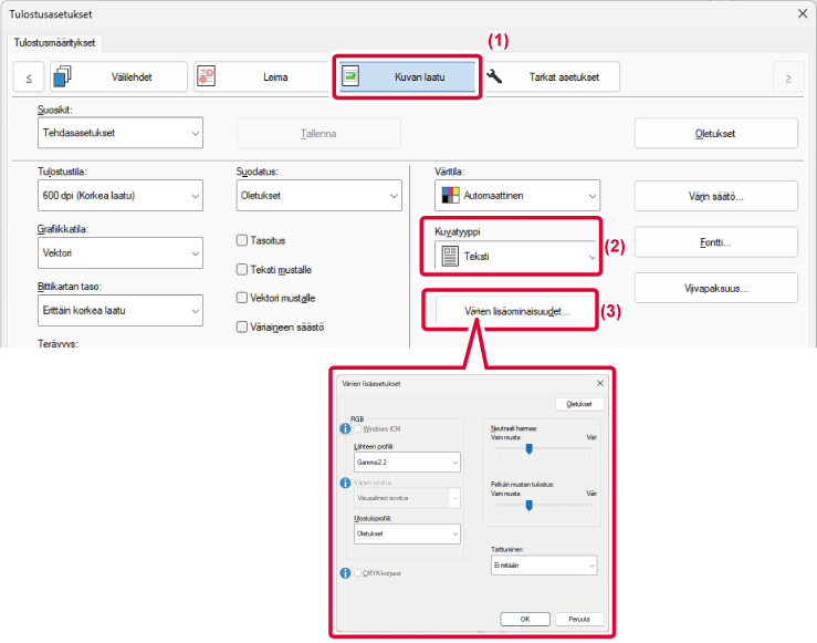 laitteen tulosajurissa. Nämä mahdollistavat tulostuksen käyttämällä värikuvatyypille