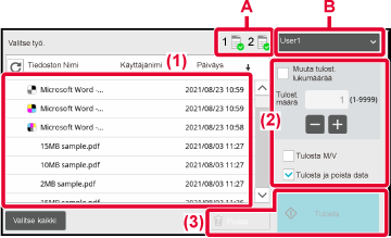 - Jos valittu työ on PS-tiedosto, työ tulostetaan