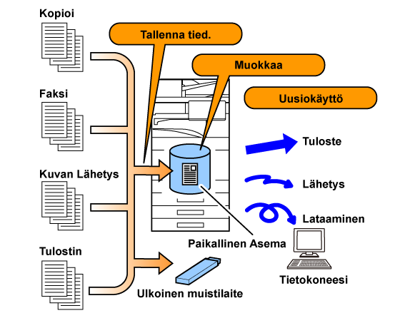 Tämän toiminnon avulla voit tallentaa asiakirjatiedot paikalliselle asemalle kopiointi-, kuvanlähetys- tai muun työn aikana. Käytä toimintoa silloin, kun haluat tallentaa asiakirjatietoja nopeasti ja helposti tiedoston nimeä tai muita tietoja määrittämättä. Tallennettu tiedosto on myös muiden käytettävissä. Älä käytä tätä tallennusmenetelmää, jos et halua muiden käyttävän tiedostoja. |