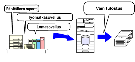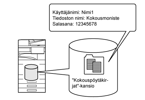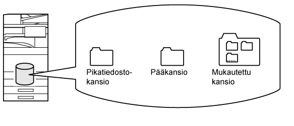 Tämän toiminnon avulla voit tallentaa asiakirjatiedot paikalliselle asemalle kopiointi-, kuvanlähetys- tai muun työn aikana. Pikatiedosto-toiminnosta poiketen voit lisätä tiedostoon tallennuksen yhteydessä erilaisia tietoja, mikä tehostaa tiedostonhallintaa. Myös salasana voidaan määrittää. |