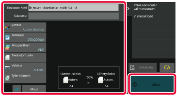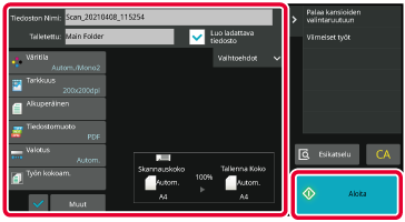 Aseta alkuperäinen automaattisen syöttölaitteen asiakirjan syöttötasolle tai valotuslasille.Tarkista tiedoston nimi ja tallennussijainti ja kosketa niiden asetuksien näppäimiä, jotka haluat valita.