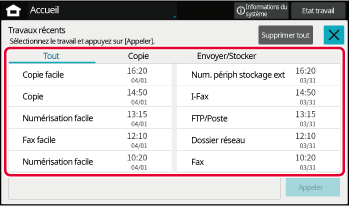 Jusqu'à 10 travaux les plus récemment utilisés dans une liste.