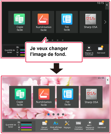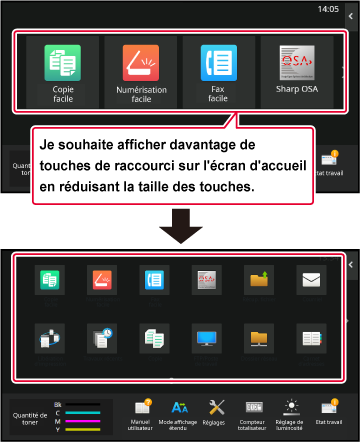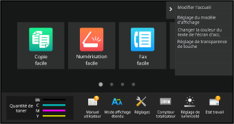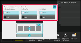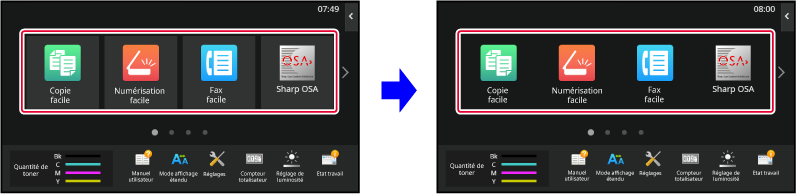 Les réglages sont enregistrés dans la machine et ils sont appliqués.Plusieurs modèles de disposition de l'écran