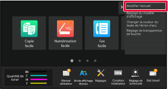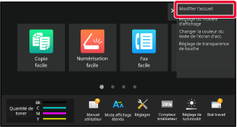 L'écran passe sur l'écran des réglages.Appuyez sur [Réglages système] → [Réglages de l'écran d'accueil] → [Fond de page], puis appuyez sur la touche [Modifier].