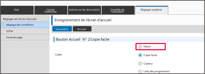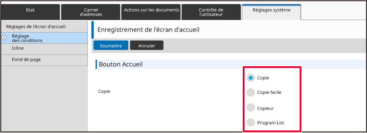 Certains réglages peuvent nécessiter que vous saisissiez votre mot de passe utilisateur après avoir cliqué sur [Réglages de l'écran d'accueil]. Si vous n'avez pas réalisé l'authentification utilisateur, vous devez saisir le mot de passe administrateur.Cliquez sur [Réglage des conditions], puis cliquez sur l'élément souhaité sous "Touche fixe".