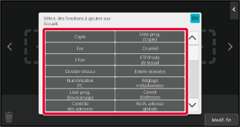 Certains réglages peuvent nécessiter que vous saisissiez votre mot de passe utilisateur après avoir cliqué sur [Réglages de l'écran d'accueil]. Si vous n'avez pas réalisé l'authentification utilisateur, vous devez saisir le mot de passe administrateur.Sélectionnez la fonction à ajouter.