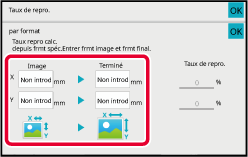 Appuyez sur la zone du format d’image et du format de sortie et saisissez les formats en utilisant les touches numériques.Cette section explique comment spécifier