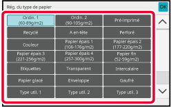 Lorsque vous modifiez le type de papier en appuyant sur la touche [Choix papier], appuyez sur l'onglet [Type] et sélectionnez le type de papier.Appuyez sur la touche [Format], puis sur la touche qui correspond au format du papier chargé.