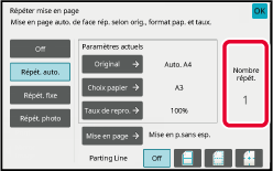 Le compte de répétition maximum pour les images copiées sur une feuille se calcule automatiquement en fonction de la taille de l'original, du papier et du rapport de copie sélectionné sur l'écran initial. |