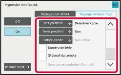 Pour spécifier les réglages d'impression, vous pouvez sélectionner un des textes prédéfinis ou utiliser le clavier logiciel. Vous pouvez également imprimer le numéro de série et l'ID de travail de compte.Appuyez sur la touche [Couleur Départ] ou [N&B Départ] pour démarrer la copie.