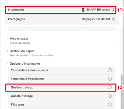 - Sélectionnez [Gestion des travaux] dans « Options de l'imprimante ».
