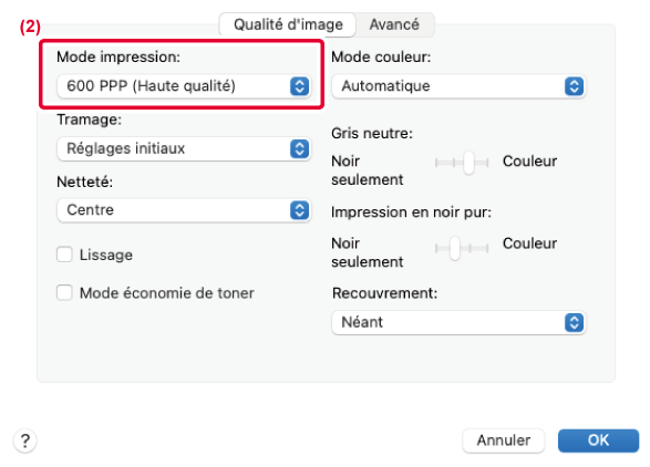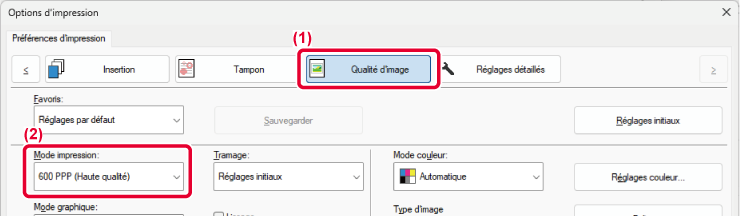 Sélectionnez ce mode pour imprimer des photos en couleur avec une définition supérieure et pour imprimer des lignes fines et nettes. |