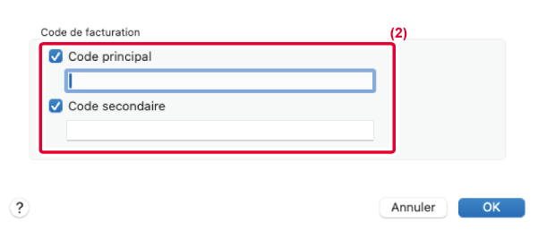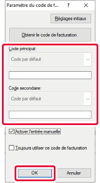 Sous Windows 10, cliquez sur le nom du pilote de l'imprimante, cliquez sur [Gérer] et sur [Options d'impression].Spécifiez un code de facturation.