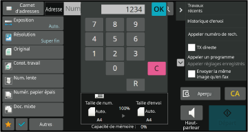Appuyez sur la touche [Entrée directe] ou [Numéro de fax] pour saisir le numéro de fax de destination.
