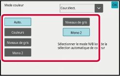 Appuyez sur la touche [Niveaux de gris] ou [Mono 2] pour régler le mode N/B en sélection couleur automatique.
