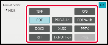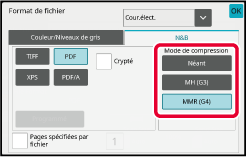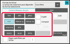 *1 Lorsque PDF (y compris chiffré et compression élevée) est sélectionné pour le format de fichier, la compression Flate peut être utilisée pour réduire le format de fichier.