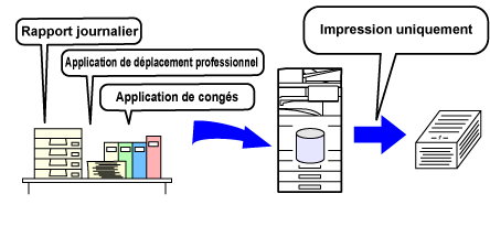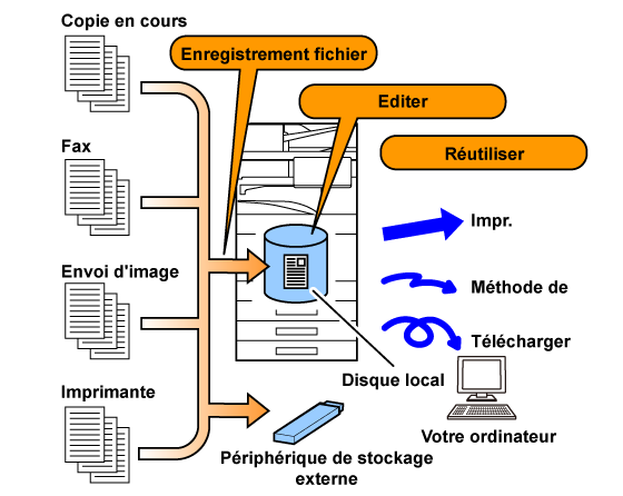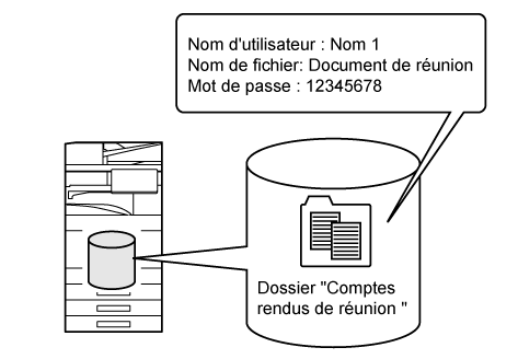 Pendant qu'une copie, un envoi d'image ou un autre travail est exécuté, cette fonction enregistre les données du document sur le disque local. A la différence de Fichier temporaire, divers types d'informations peuvent être joints au fichier quand il est enregistré pour permettre une gestion de fichier efficace. Vous pouvez également définir un mot de passe. |