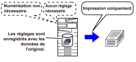 Pendant qu'une copie, un envoi d'image ou un autre travail est exécuté, cette fonction enregistre les données du document sur le disque local. Utilisez cette fonction quand vous voulez enregistrer rapidement et facilement les données d'un document sans indiquer un nom de fichier ni d'autres informations. N'importe qui peut utiliser le fichier enregistré. N'utilisez pas cette méthode pour enregistrer des fichiers confidentiels. |