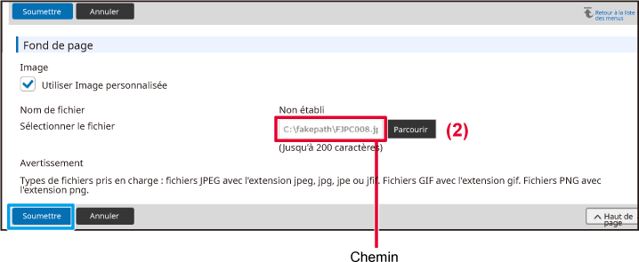 Sélectionnez "Utiliser Image personnalisée", puis cliquez sur le bouton [Parcourir] pour sélectionner l'image souhaitée.