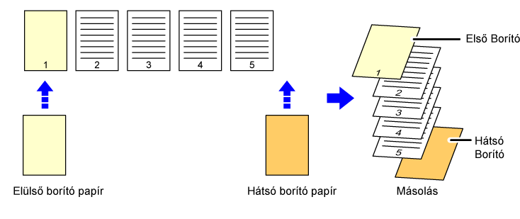 ![]() Beilleszt egy előlapot a másolatok elé, és az ötödik és hatodik eredeti oldal kétoldalas másolatát teszi rá a hátlapra. |