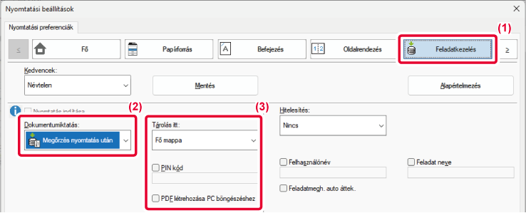 - Válassza ki a nyomtatási adatok mentési módját a "Document Filing"