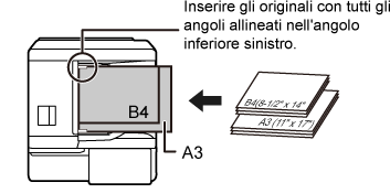 Utilizzare questa impostazione se gli originali che sono in 2 tipi di formato diverso hanno i lati della stessa lunghezza. Gli originali devono essere inseriti nel vassoio dell'alimentatore di documenti con i lati della stessa lunghezza allineati a sinistra. • A3 e A4 • B4 e B5 • A4R e A5 • 11" x 17" e 8-1/2" x 11" • 8-1/2" x 14" e 8-1/2" x 11"R • 8-1/2" x 14" e 5-1/2" x 8-1/2" • 8-1/2" x 13" e 8-1/2" x 11"R • 8-1/2" x 13" e 5-1/2" x 8-1/2" • 8-1/2" x 11"R e 5-1/2" x 8-1/2" |