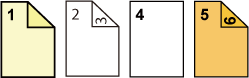 ![]() Esegue una copia a due facciate della prima e seconda pagina originale, per la copertina anteriore, e crea una copia solo fronte della sesta pagina dell'originale per la copertina posteriore. Viene eseguita una copia a una facciata della quinta pagina dell'originale. |